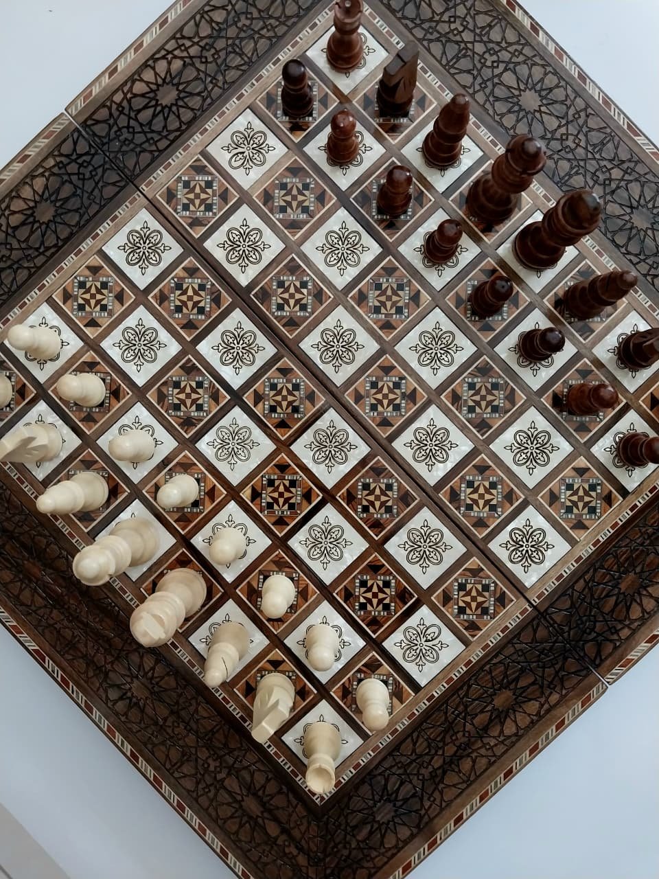 Local and American walnut wood, Silver thread, Camel bone