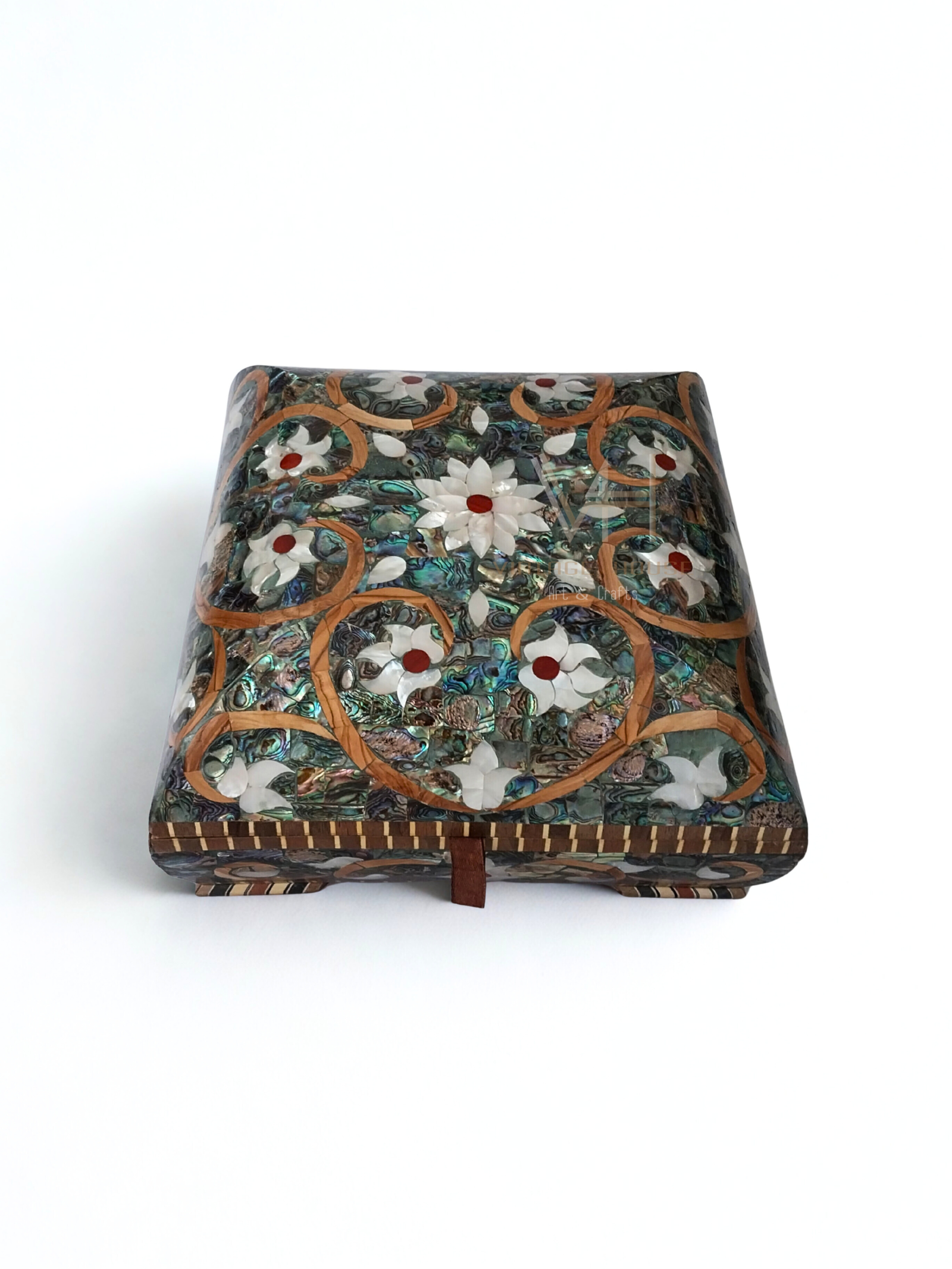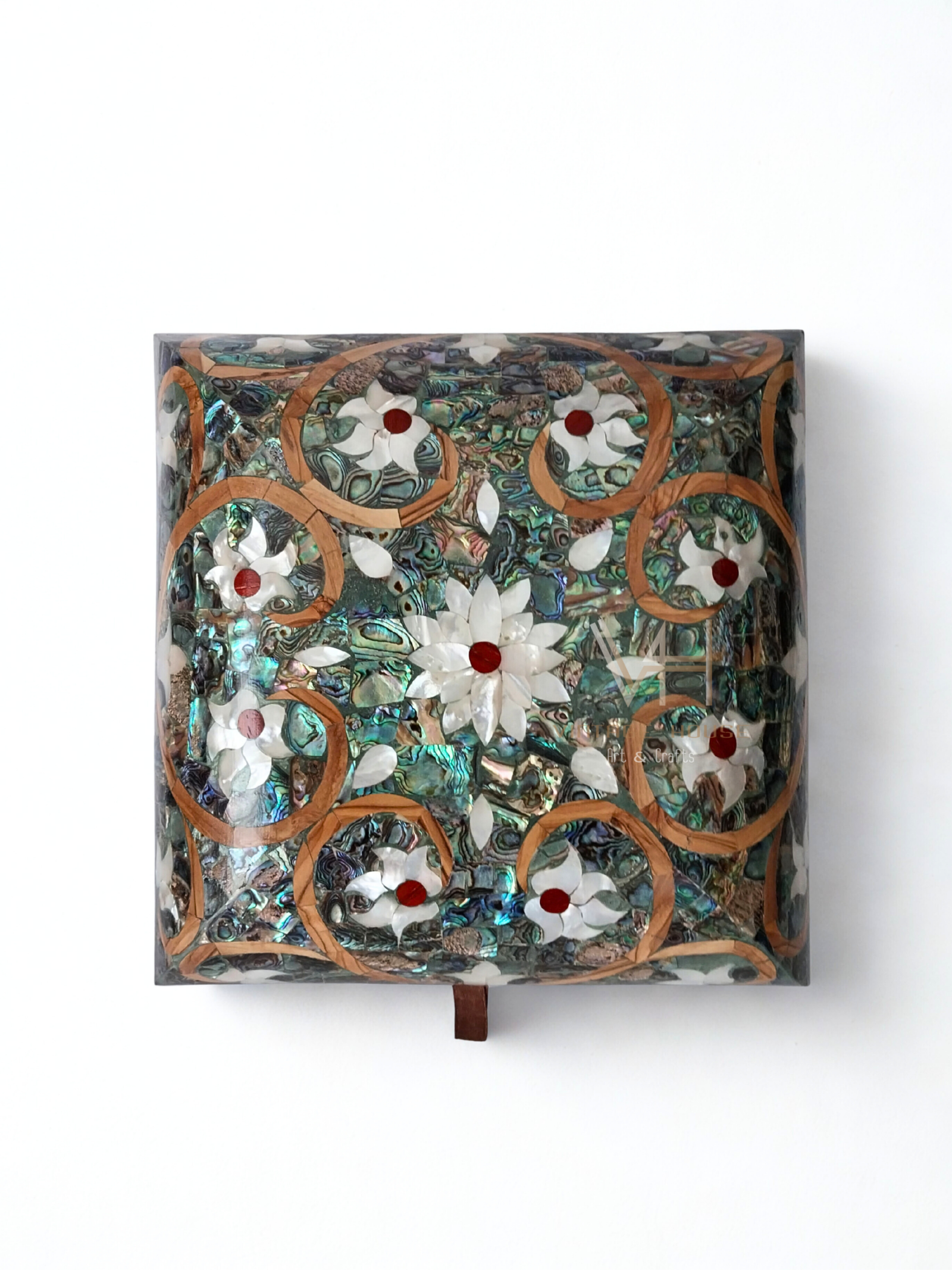 This unique masterpiece is proudly handcrafted using natural materials, designed to be treasured for generations. Its luminous mother-of-pearl finish and striking patterns make it both a functional jewellery box and a statement piece of art.
