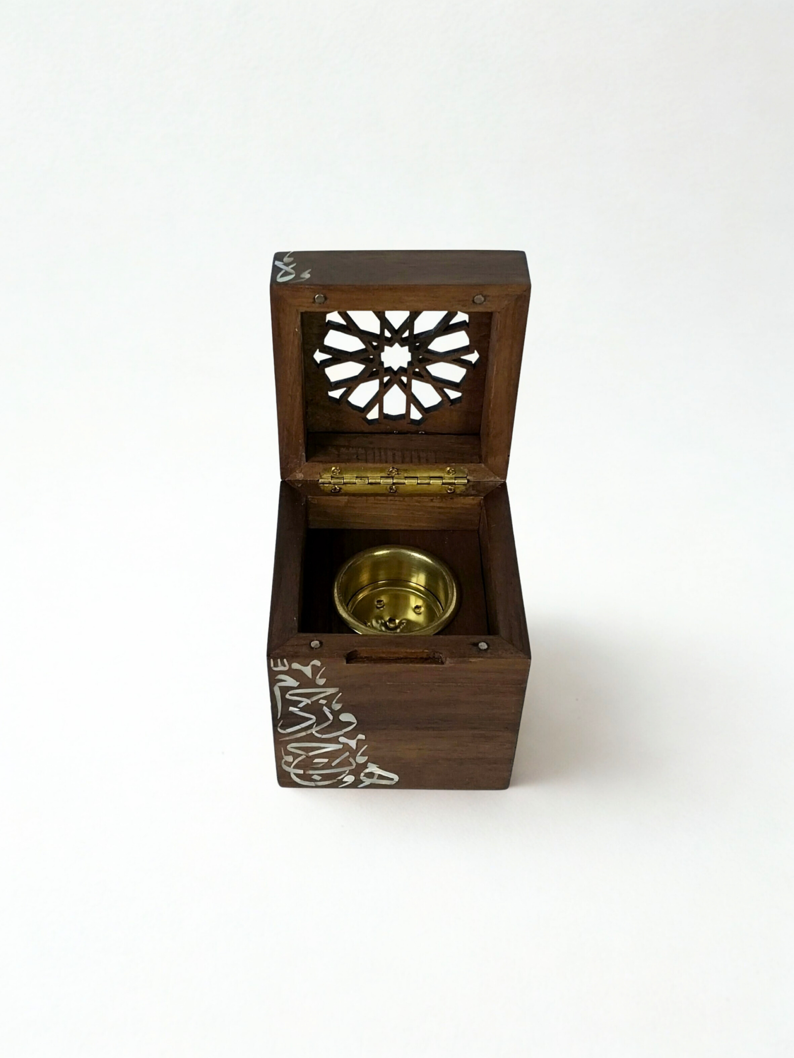 RIWĀQ is a luxurious Arabic calligraphy incense burner, handcrafted from the finest solid walnut wood and meticulously inlaid by hand with premium, luminous mother-of-pearl. Its design is inspired by the elegance of Arabic letters, transformed into flowing calligraphic forms that reflect heritage, artistry, and refinement.