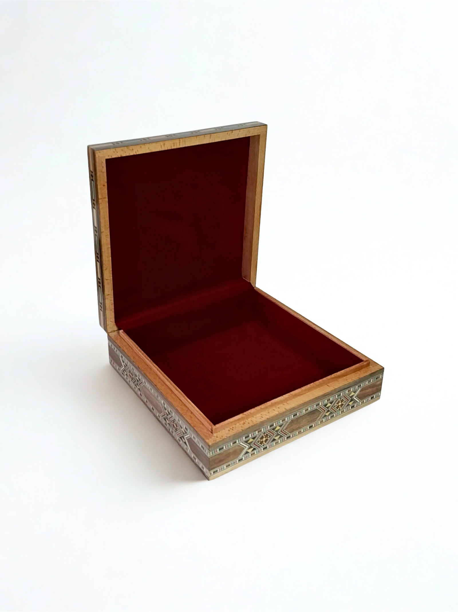 A handcrafted marquetry box made from natural wood with mother-of-pearl-skin inlay and mosaic. The UAE emblem is engraved on the inlay, creating a refinement. Ideal for storing jewelry, watches, ties, or oud. Made by skilled artisans to last for generations.